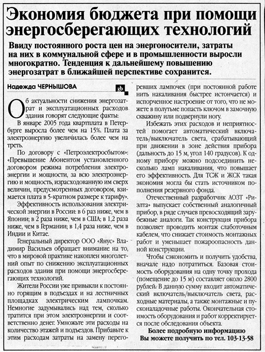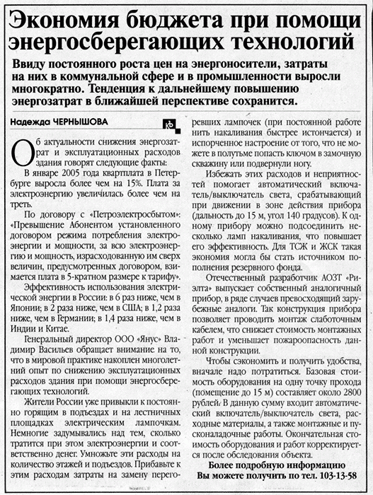 Экономия бюджета при помощи энергосберегающих техологий (газета "Консьержъ" №5 от 07.02.2005г.)